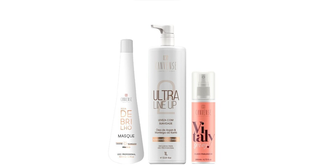 Kit Canvense composto por 1 Água de Brilho Masque 500 ml, 1 Ultra Line Up Alinhamento Térmico 1 L e 1 Vitaly Spray 200 ml