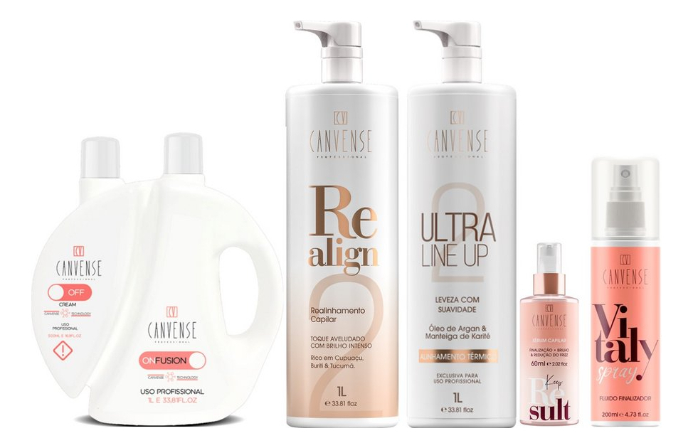 Kit Canvense composto por 1 Duo OnFusion OffCream 1,5 L, 1 Realign Realinhamento Capilar Alinhamento 1 L, 1 Ultra Line Up Alinhamento Térmico 1 L, 1 Keep Result Sérum 60 ml e 1 Vitaly Spray 200 ml