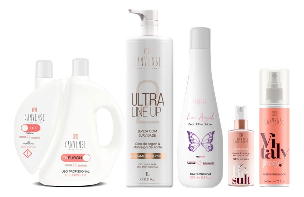 Kit Canvense composto por 1 Duo OnFusion OffCream 1,5 L, 1 Ultra Line Up Alinhamento Térmico 1 L, 1 Lux Angel 1 Pearl Effect Mask 500 ml, 1 Keep Result Sérum 60 ml e 1 Vitaly Spray 200 ml