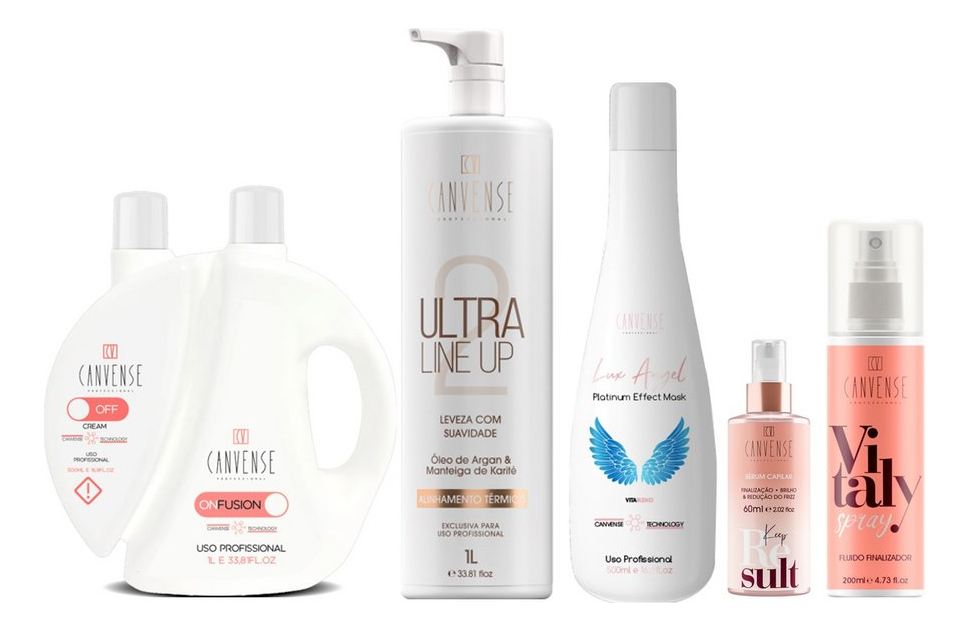 Kit Canvense composto por 1 Duo OnFusion OffCream 1,5 L, 1 Ultra Line Up Alinhamento Térmico 1 L, 1 Lux Angel 2 Platinum Effect Mask 500 ml, 1 Keep Result Sérum 60 ml e 1 Vitaly Spray 200 ml